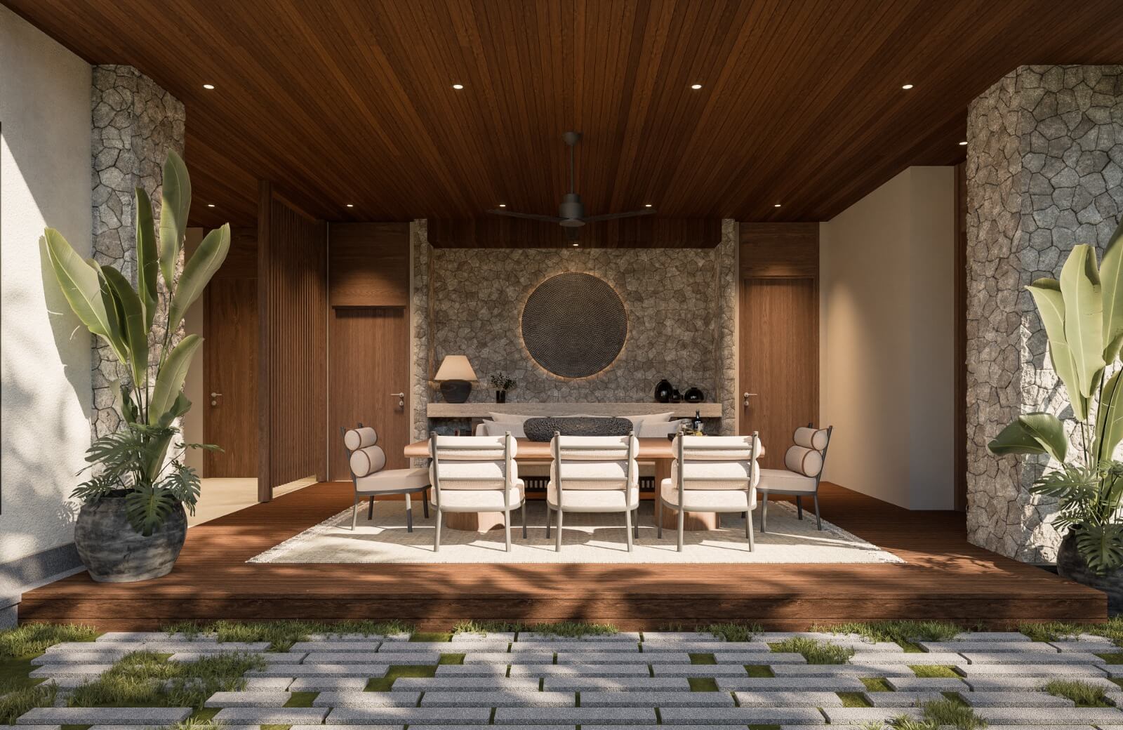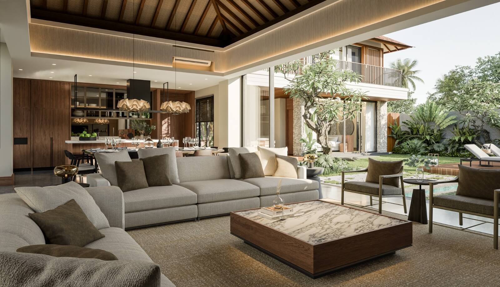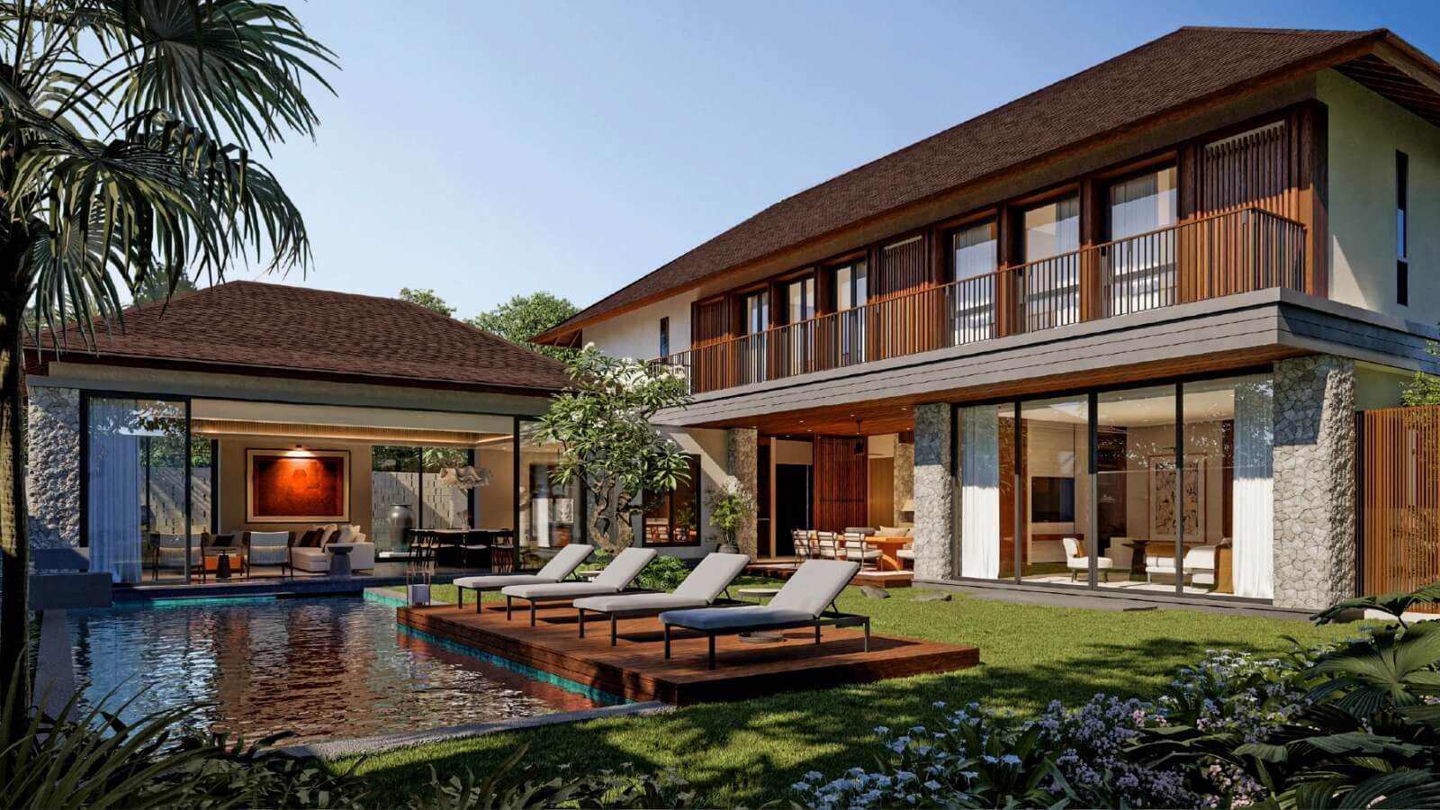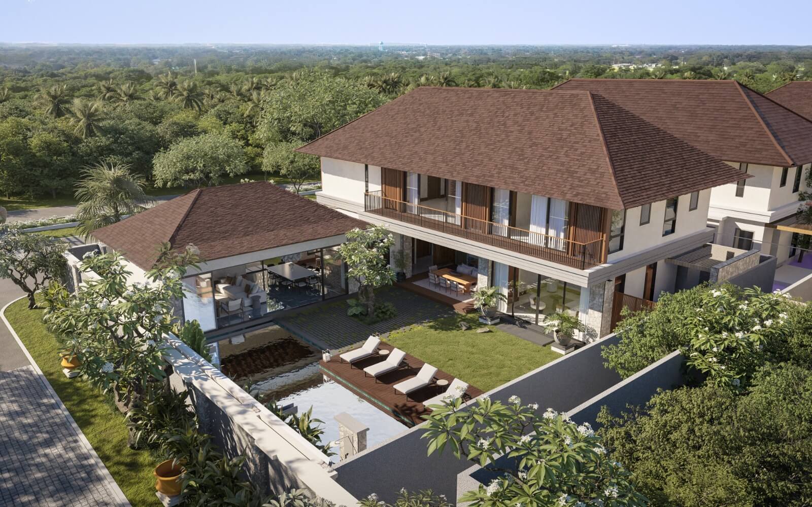 Built on a generous 625 sq m land area with 520 sq m of living space, Legong Villa offers 5+1 bedrooms, 5+1 bathrooms, two spacious living rooms, and two dining areas — ideal for hosting family gatherings or entertaining guests in refined comfort. The villa’s open-plan concept harmoniously integrates indoor elegance with outdoor tropical beauty, centered around a private swimming pool framed by lush greenery.