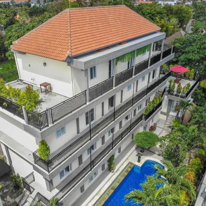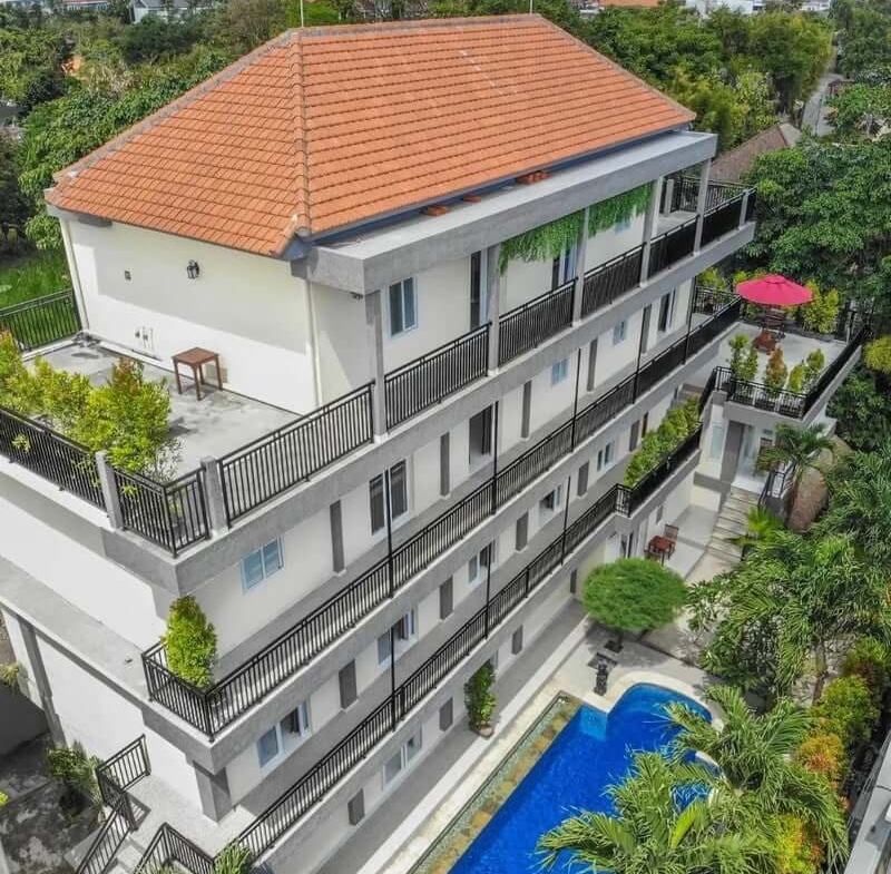 Built on 1,000 m² (10 are) of land with a total building size of 1,300 m², the property comprises four modern buildings across four floors. It features 27 bedrooms and 27+2 bathrooms, each equipped with air conditioning, wardrobe, private kitchen, Wi-Fi, refrigerator, and safe deposit box. The property also includes a swimming pool, coworking space, terrace, and carport for four cars plus multiple motorbikes. Access is excellent, with an 8-meter-wide asphalt road connecting to key Canggu destinations such as Deus Ex Machina (500 meters) and Echo Beach (10 minutes).